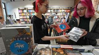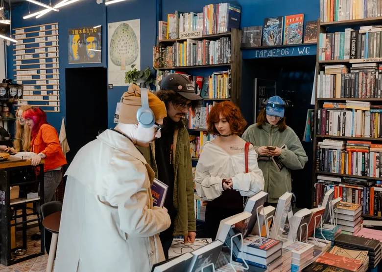 Customers at an LGBTQ bookstore in Russia.