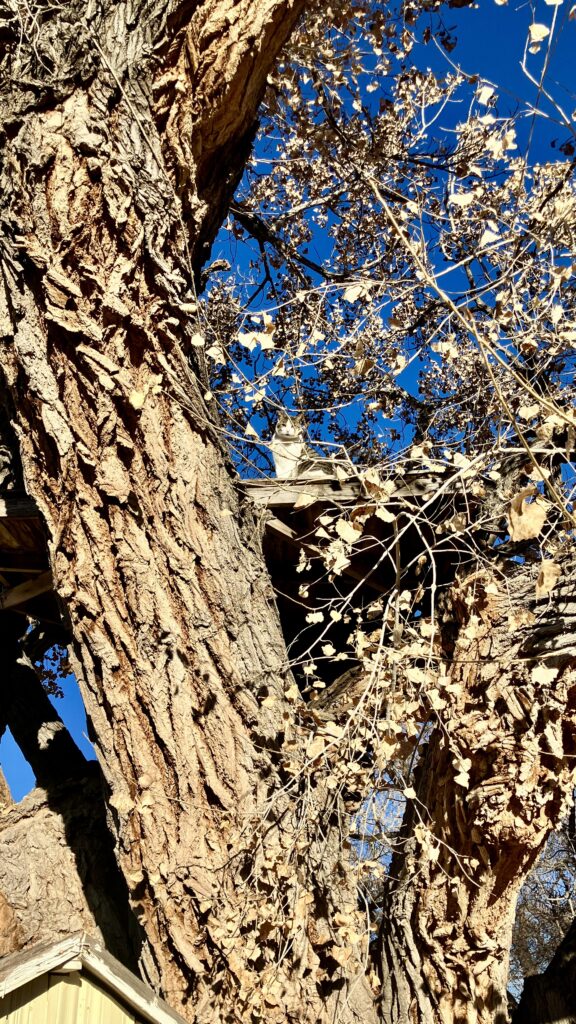 I went to visit Sparrow Hawk Farm near Sabinal, NM where my friend Beth lives, in early December . She keeps bees and makes candles and I went to buy some from her during her annual open house. I was the only customer at the moment. There was hot apple cider simmering on the stove and she graciously poured me a mug full. She mentioned she had to go turn the water off out where the animals were and asked if I wanted to tag along. We walked out the back door into the afternoon sunshine and passed under a cottonwood tree.